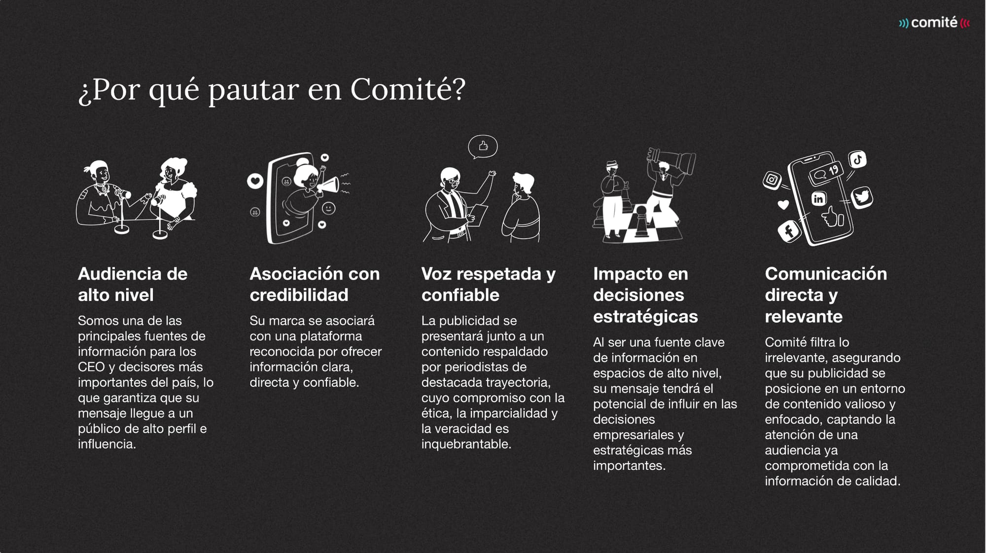 Comité tiene una audiencia compuesta por los principales tomadores de decisión del país: altos ejecutivos del sector empresarial (incluidos los CEO de las principales compañías del medio), autoridades políticas y gubernamentales, directivos de organizaciones de la sociedad civil, representantes diplomáticos, líderes de opinión y referentes del ámbito académico.